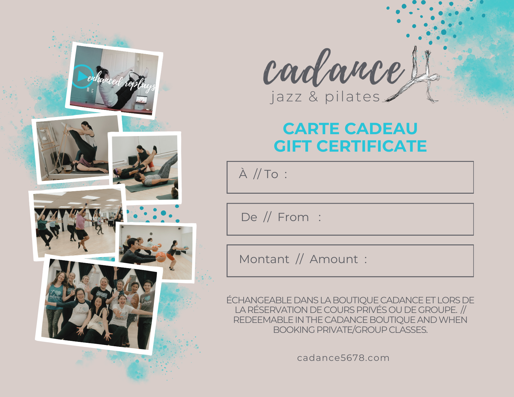 Une fois votre paiement et votre formulaire reçus, je vous enverrai un PDF de votre carte-cadeau, qui comprendra le numéro de certificat que le destinataire pourra utiliser dans la boutique Cadance. Le nom du destinataire et le message du destinataire seront inclus sur le certificat tel que vous l’avez saisi dans le formulaire ci-dessus. Vous pouvez ensuite transmettre le certificat au destinataire ou demander que je l’envoie directement au destinataire par e-mail (veuillez inclure les informations pertinentes dans « autres notes »).