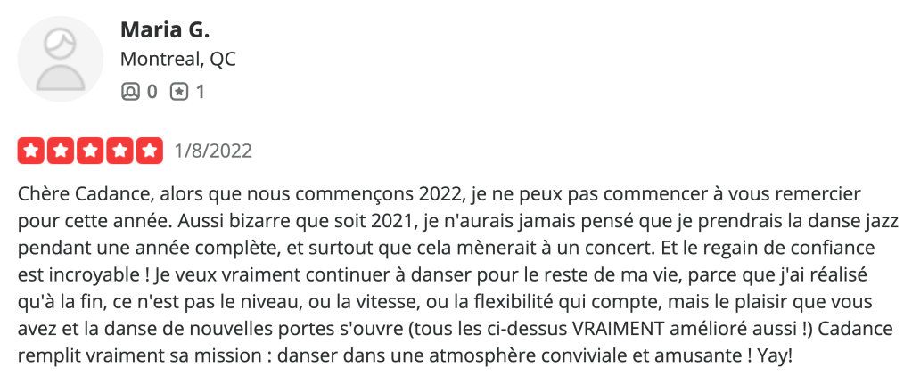 Quand j’ai déménagé de Toronto à Montréal, j’avais de la difficulté à trouver des cours qui s’adaptent à mon niveau de danse et qui me permettaient de relever des défis. C’est là que j’ai rencontré Rachel, une prof extraordinaire qui me pousse et m’encourage à améliorer mon côté technique chaque semaine. Je quitte toujours son cours en me sentant bien comme après un entraînement vigoureux. Ses cours me permettent aussi de prendre du temps pour moi, une pause de ma vie chargée et des besoins de ma famille, ce que j’apprécie beaucoup. Je danse depuis que j’ai 4 ans, mes cours avec Rachel ont rallumer la flamme que j’avais pour cette activité. Je recommande vivement ses cours à tout le monde, qu’attendez-vous?!